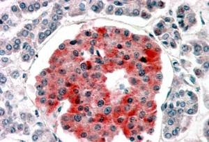 AMM05028G (3.8 μg/ml) staining of paraffin embedded Human Pancreas. Steamed antigen retrieval with citrate buffer pH 6, AP-staining.