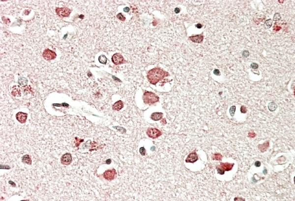APR16350G (5 μg/ml) staining of paraffin embedded Human Cerebral Cortex. Steamed antigen retrieval with citrate buffer pH 6, AP-staining.