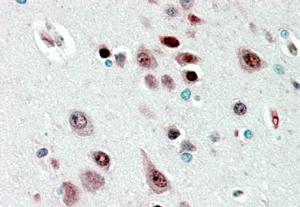 APR12144G (2.5 μg/ml) staining of paraffin embedded Human Cerebral Cortex. Steamed antigen retrieval with citrate buffer pH 6, AP-staining.