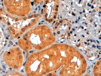 AMM05069G (2 μg/ml) staining of paraffin embedded Human Kidney. Steamed antigen retrieval with citrate buffer pH 6, HRP-staining. |