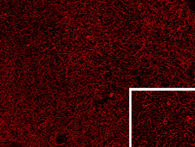 APG03365G (0.3 μg/ml) staining of PFA-perfused cryosection of Human Hypothalamus. Antigen retrieval with citrate buffer pH 6 at 80C for 30min, Cy3-staining. Data obtained by Prof. Erik Hrabovszky, Inst, Exp, Med., Budapest, Hungary. |