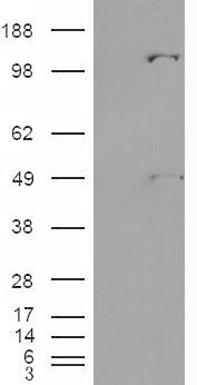 HEK293 overexpressing Human Pyruvate Carboxylase (RC221895) and probed with AMM05102G (mock transfection in first lane), tested by Origene. |
