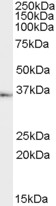 APR12189G (1 μg/ml) staining of Human Testes lysate (35 μg protein in RIPA buffer). Primary incubation was 1 hour. Detected by chemiluminescence. |