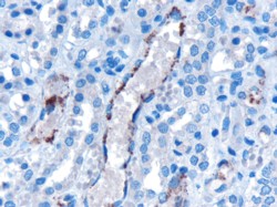 APR16421G (10 μg/ml) staining of paraffin embedded human kidney. Microwaved antigen retrieval with Tris/EDTA buffer pH9, HRP-staining. |