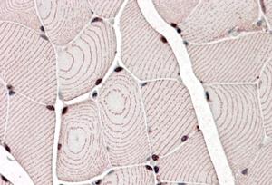 APR16432G (3.8 μg/ml) staining of paraffin embedded Human Skeletal Muscle. Steamed antigen retrieval with citrate buffer pH 6, AP-staining. |