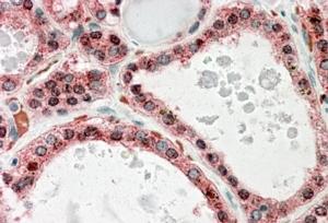 APR12123G (3.8 μg/ml) staining of paraffin embedded Human Thyroid Gland. Steamed antigen retrieval with citrate buffer pH 6, AP-staining. |