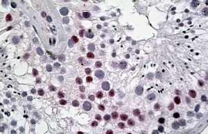 APR11731G (5 μg/ml) staining of paraffin embedded Human Human Testis. Steamed antigen retrieval with citrate buffer pH 6, AP-staining. |