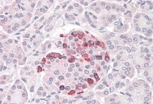 AMM07929G (3.8 μg/ml) staining of paraffin embedded Human Pancreas. Steamed antigen retrieval with citrate buffer pH 6, AP-staining. |