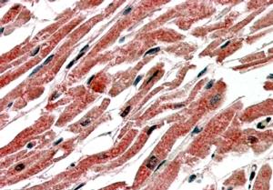APG02751G (3.8 μg/ml) staining of paraffin embedded Human Heart. Steamed antigen retrieval with citrate buffer pH 6, AP-staining. |