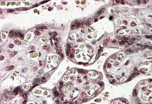 APR17552G (3.8 μg/ml) staining of paraffin embedded Human Placenta. Steamed antigen retrieval with citrate buffer pH 6, AP-staining. |