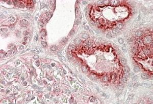 AMM08468G (3.8 μg/ml) staining of paraffin embedded Human Kidney-. Steamed antigen retrieval with citrate buffer pH 6, AP-staining.