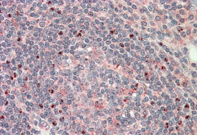 APR15595G (5 μg/ml) staining of paraffin embedded Human Tonsil. Steamed antigen retrieval with citrate buffer pH 6, AP-staining. |