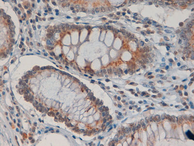 APR08001G (4 μg/ml) staining of paraffin embedded Human Colon. Steamed antigen retrieval with citrate buffer pH 6, HRP-staining. |