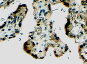 APR08110G (4 μg/ml) staining of paraffin embedded Human Placenta. Steamed antigen retrieval with citrate buffer pH 6, HRP-staining. |