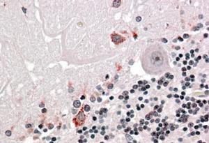 AMR09552G (3.8 μg/ml) staining of paraffin embedded Human Cerebellum. Steamed antigen retrieval with citrate buffer pH 6, AP-staining. |