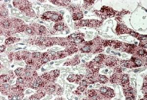 APR10298G (3.8 μg/ml) staining of paraffin embedded Human Liver-. Steamed antigen retrieval with citrate buffer pH 6, AP-staining. |