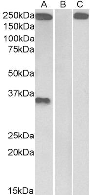 HEK293 lysate (10ug protein in RIPA buffer) overexpressing Human THBS1 with C-terminal MYC tag probed with APR10460G (0.1ug/ml) in Lane A and probed with anti-MYC Tag (1/1000) in lane C. Mock-transfected HEK293 probed with APR10460G (0.1ug/ml) in Lane B. Primary incubations were for 1 hour. Detected by chemiluminescence. |
