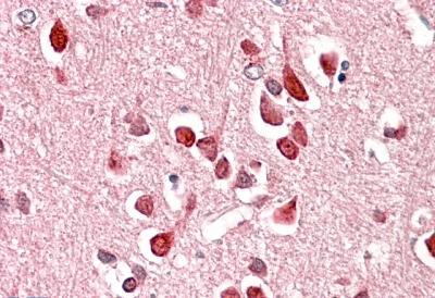 APR13947G (3.8 μg/ml) staining of paraffin embedded Human Cerebral Cortex. Steamed antigen retrieval with citrate buffer pH 6, AP-staining. |