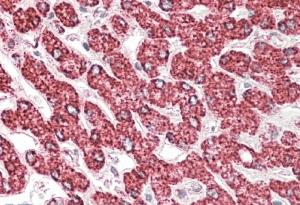 AMM04461G (3.8 μg/ml) staining of paraffin embedded Human Liver. Steamed antigen retrieval with citrate buffer pH 6, AP-staining. |