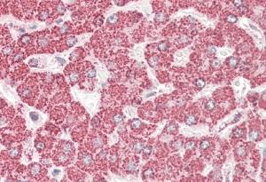 AMM04460G (3.8 μg/ml) staining of paraffin embedded Human Liver. Steamed antigen retrieval with citrate buffer pH 6, AP-staining. |