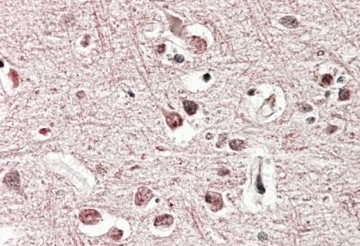 APR12293G (3.8 μg/ml) staining of paraffin embedded Human Cerebral Cortex. Steamed antigen retrieval with citrate buffer pH 6, AP-staining. |