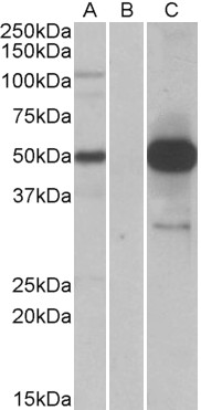 HEK293 lysate (10ug protein in RIPA buffer) overexpressing Human COPS3 with DYKDDDDK tag probed with APR11646G (1.0ug/ml) in Lane A and probed with anti-DYKDDDDK Tag (1/5000) in lane C. Mock-transfected HEK293 probed with APR11646G (1mg/ml) in Lane B. Primary incubations were for 1 hour. Detected by chemiluminescence. |