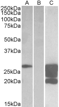 HEK293 lysate (10ug protein in RIPA buffer) overexpressing Human GM2A with DYKDDDDK tag probed with APR16168G (1.0ug/ml) in Lane A and probed with anti- DYKDDDDK Tag (1/30000) in lane C. Mock-transfected HEK293 probed with APR16168G (1mg/ml) in Lane B. Primary incubations were for 1 hour. Detected by chemiluminescence.