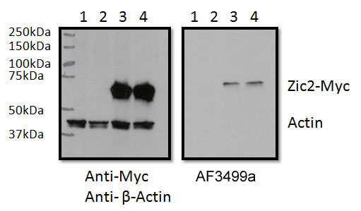 RWPE1 lysate (60ug protein in RIPA buffer) overexpressing Human ZIC2 with C-terminal MYC tag probed with APR14035G (0.5ug/ml) in the right panel and probed with anti-MYC Tag (1/1000) and anti-beta-Actin in the left panel. Mock-transfected RWPE1 in lanes 1 and expressing GFP in lanes 2. Primary incubations were overnight at 4C. Detected by chemiluminescence. |