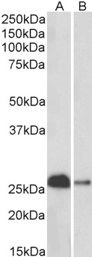 APR11537G (0.1 μg/ml) staining of Mouse (A) and Rat (B) Brain lysates (35 μg protein in RIPA buffer). Primary incubation was 1 hour. Detected by chemiluminescence. |