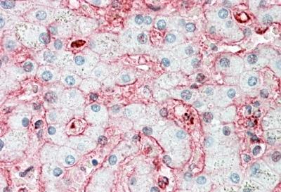 APR13587G (5 μg/ml) staining of paraffin embedded Human Liver. Steamed antigen retrieval with citrate buffer pH 6, AP-staining.
