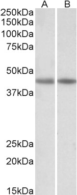 APG02775G (0.03 μg/ml) staining of Human (A) and Mouse (B) Heart lysates (35 μg protein in RIPA buffer). Primary incubation was 1 hour. Detected by chemiluminescence. |