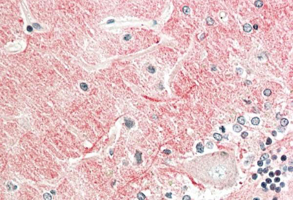 APR11637G (5 μg/ml) staining of paraffin embedded Human Cerebellum. Steamed antigen retrieval with citrate buffer pH 6, AP-staining. |
