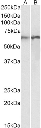 APR15258G (0.01 μg/ml) staining of Human (A) and Rat (B) Lung lysates (35 μg protein in RIPA buffer). Primary incubation was 1 hour. Detected by chemiluminescence. |