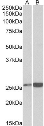 APR09045G (0.3 μg/ml) staining of Heart (A) and Liver (B) lysates (35 μg protein in RIPA buffer). Primary incubation was 1 hour. Detected by chemiluminescence. |