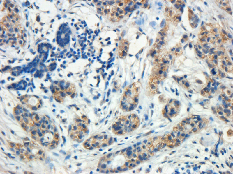 APR12171G (5 μg/ml) staining of paraffin embedded Human Breast cancer. Heated antigen retrieval with citrate buffer pH 6, DAB-staining. |