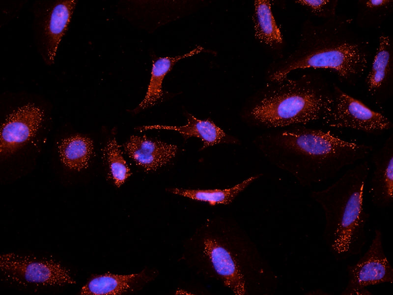 AMM04950G (2.5 μg/ml) staining of PFA-fixed and TX100-treated HeLa cells after primary labelling overnight at 4C with DAPI nuclear counterstaining in blue. |