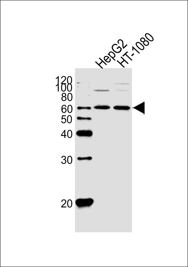 Western blot analysis of lysates from HepG2, HT-1080 cell line (from left to right), using Phospho-Smad1/5 (Ser463/465).ctrl3(Cat. APR17872G). APR17872G was diluted at 1:1000 at each lane. A goat anti-rabbit IgG H&L(HRP) at 1:10000 dilution was used as the secondary antibody. |