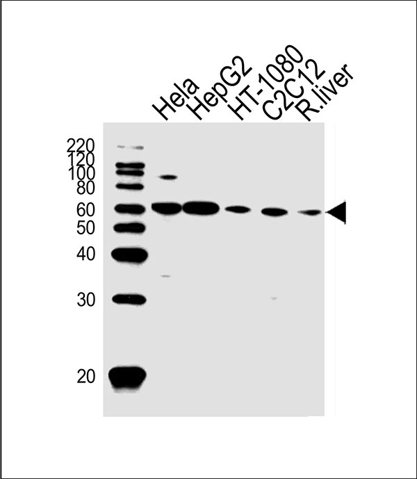 Western blot analysis of lysates from Hela,HepG2,HT-1080, mouse C2C12 cell line and rat liver tissue lysate (from left to right), using SMAD1 Antibody (Center)(Cat. APR17871G). APR17871G was diluted at 1:1000 at each lane. A goat anti-rabbit IgG H&L(HRP) at 1:10000 dilution was used as the secondary antibody.