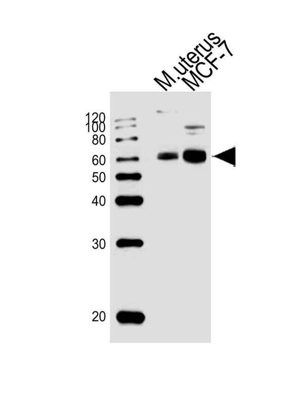 All lanes : Anti-HDAC1 Antibody (N-term) at 1:1000 dilution Lane 1: mouse uterus lysates Lane 2: MCF-7 whole cell lysates Lysates/proteins at 20 μg per lane. Secondary Goat Anti-Rabbit IgG, (H+L),Peroxidase conjugated at 1/10000 dilution Predicted band size : 60 kDa Blocking/Dilution buffer: 5% NFDM/TBST.