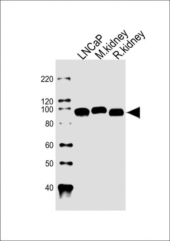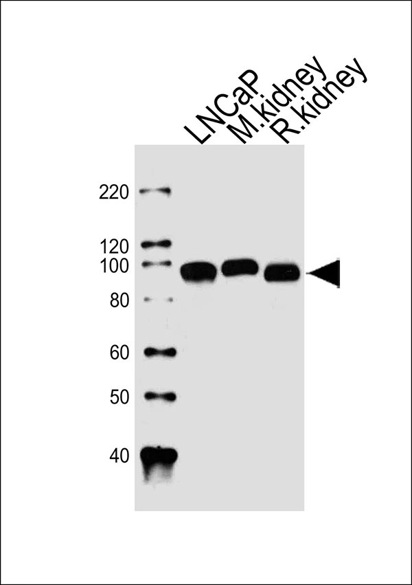 Western blot analysis of lysates from LNCaP cell line,mouse kidney and rat kidney tissue lysate(from left to right),using MME Antibody (Center)(Cat. APR17815G). APR17815G was diluted at 1:1000 at each lane. A goat anti-rabbit IgG H&L(HRP) at 1:10000 dilution was used as the secondary antibody.