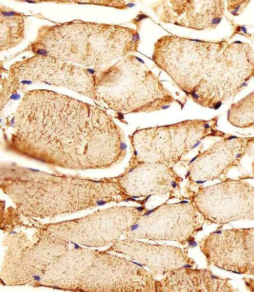 Immunohistochemical analysis of paraffin-embedded H. skeletal muscle section using MME Antibody (Center)( APR17815G). APR17815G was diluted at 1:25 dilution. A peroxidase-conjugated goat anti-rabbit IgG at 1:400 dilution was used as the secondary antibody, followed by DAB staining. |
