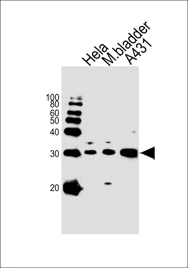 Western blot analysis of lysates from Hela cell line,mouse bladder tissue lysate,A431 cell line (from left to right), using SFN Antibody (Center)(Cat. APR17857G). APR17857G was diluted at 1:1000 at each lane. A goat anti-rabbit IgG H&L(HRP) at 1:10000 dilution was used as the secondary antibody. |