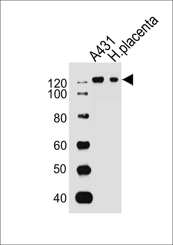 Western blot analysis of lysates from A431 cell line and human placenta tissue (from left to right), using ITA6 Antibody(Cat. APR17797G). APR17797G was diluted at 1:1000 at each lane. A goat anti-rabbit IgG H&L(HRP) at 1:10000 dilution was used as the secondary antibody. |