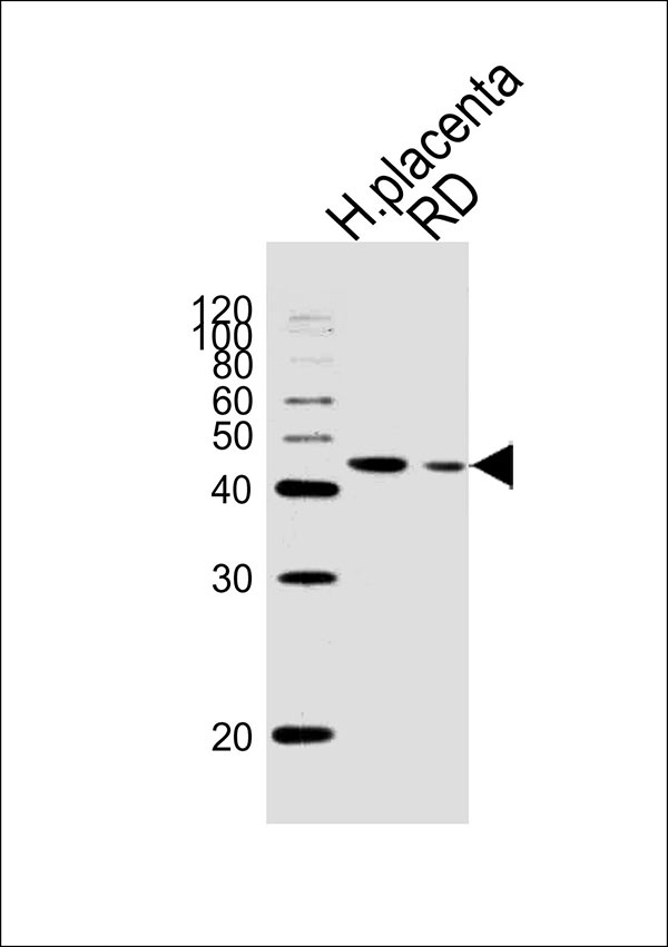 Western blot analysis of lysates from human placenta tissue lysate,RD cell line (from left to right), using ACTA1/α-actin Antibody (C-term)(Cat. AMM08742G). AMM08742G was diluted at 1:1000 at each lane. A goat anti-rabbit IgG H&L(HRP) at 1:10000 dilution was used as the secondary antibody.