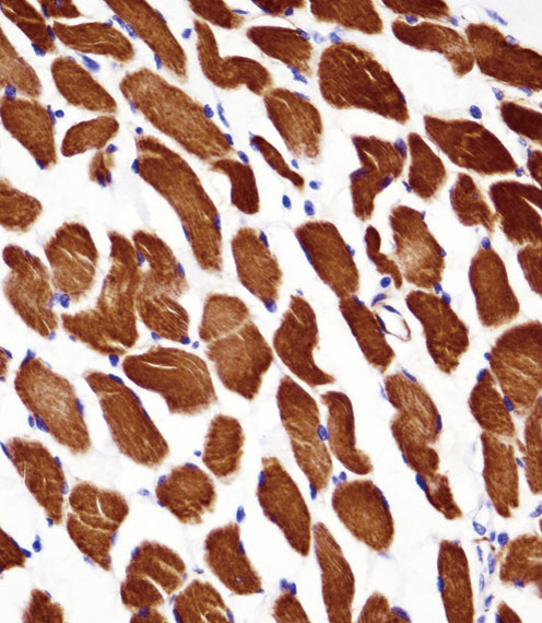 ACTA1/α-actin Antibody (C-term) (AMM08742G)immunohistochemistry analysis in formalin fixed and paraffin embedded human skeletal muscle followed by peroxidase conjugation of the secondary antibody and DAB staining.This data demonstrates the use of ACTA1/α-actin Antibody (C-term) for immunohistochemistry. Clinical relevance has not been evaluated.