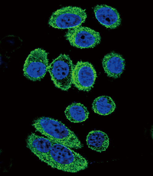Confocal immunofluorescent analysis of ACTA1/α-actin Antibody (C-term)( AMM08742G) with A549 cell followed by Alexa Fluor 488-conjugated goat anti-rabbit lgG (green).DAPI was used to stain the cell nuclear (blue). |