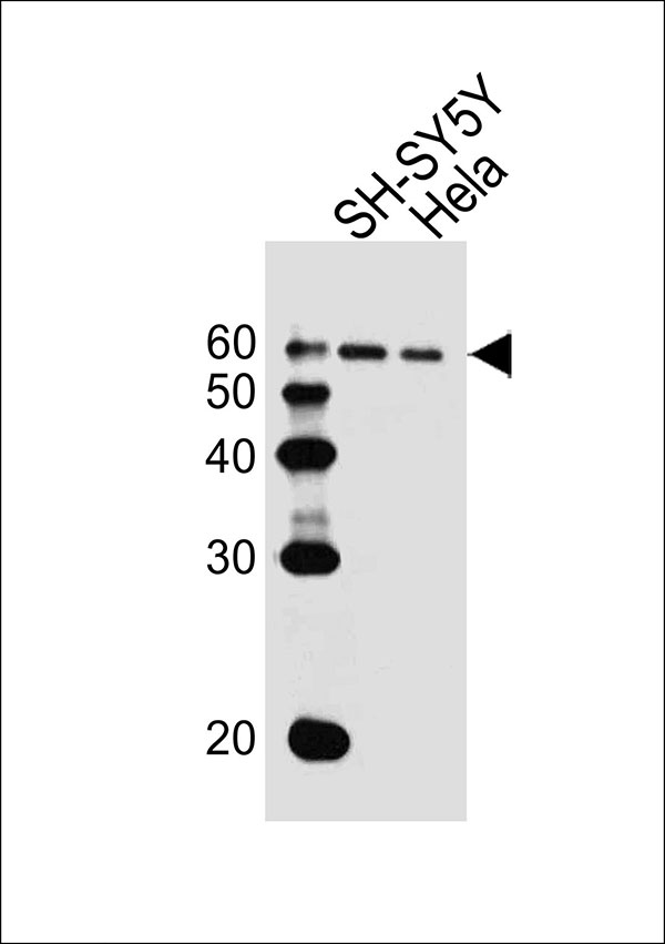 Western blot analysis of lysates from SH-SY5Y,Hela cell line (from left to right), using HDAC2 Antibody (Center)(Cat. APR17775G). APR17775G was diluted at 1:1000 at each lane. A goat anti-rabbit IgG H&L(HRP) at 1:10000 dilution was used as the secondary antibody.
