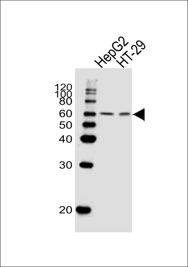 Western blot analysis of lysates from HepG2,HT-29 cell line (from left to right), using SMAD6Antibody(Center)(Cat. APR17875G). APR17875G was diluted at 1:1000 at each lane. A goat anti-rabbit IgG H&L(HRP) at 1:10000 dilution was used as the secondary antibody.