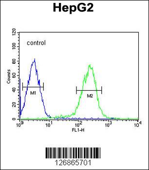 SMAD6 Antibody (Center) (Cat. APR17875G) flow cytometric analysis of HepG2 cells (right histogram) compared to a negative control cell (left histogram).FITC-conjugated goat-anti-rabbit secondary antibodies were used for the analysis. |