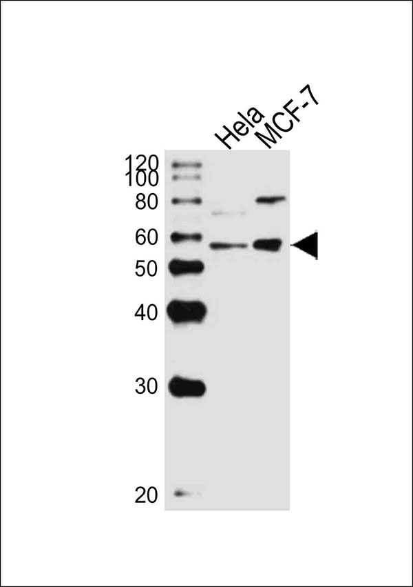 Western blot analysis of lysates from Hela,MCF-7 cell line (from left to right), using GATA6 Antibody (C-term)(Cat. APR17766G). APR17766G was diluted at 1:1000 at each lane. A goat anti-rabbit IgG H&L(HRP) at 1:10000 dilution was used as the secondary antibody.Lysates at 20ug per lane. |